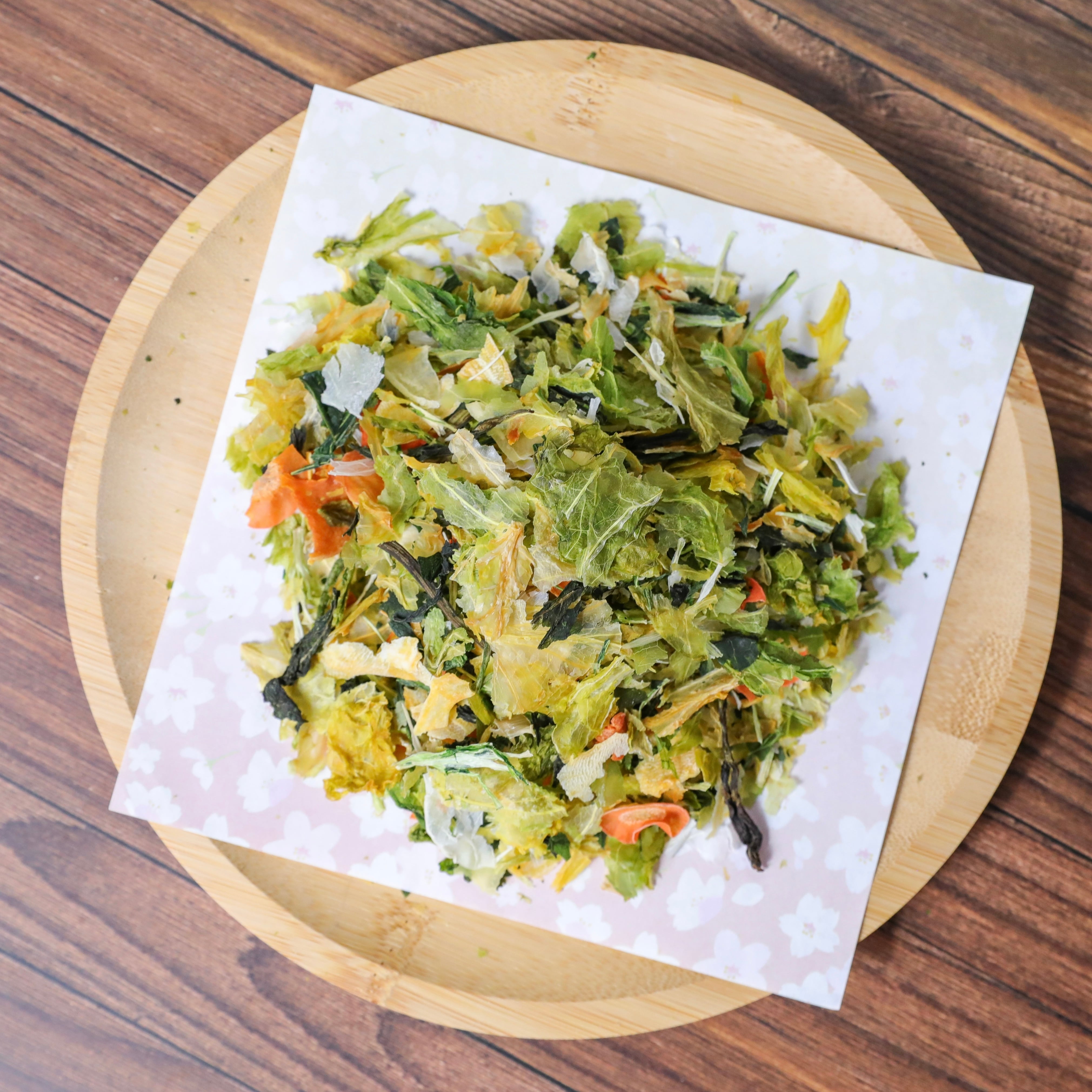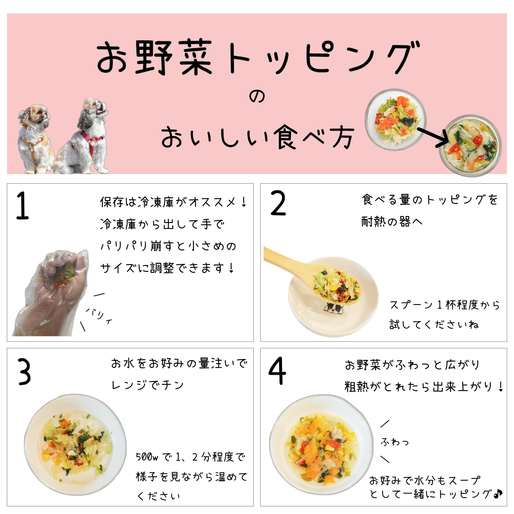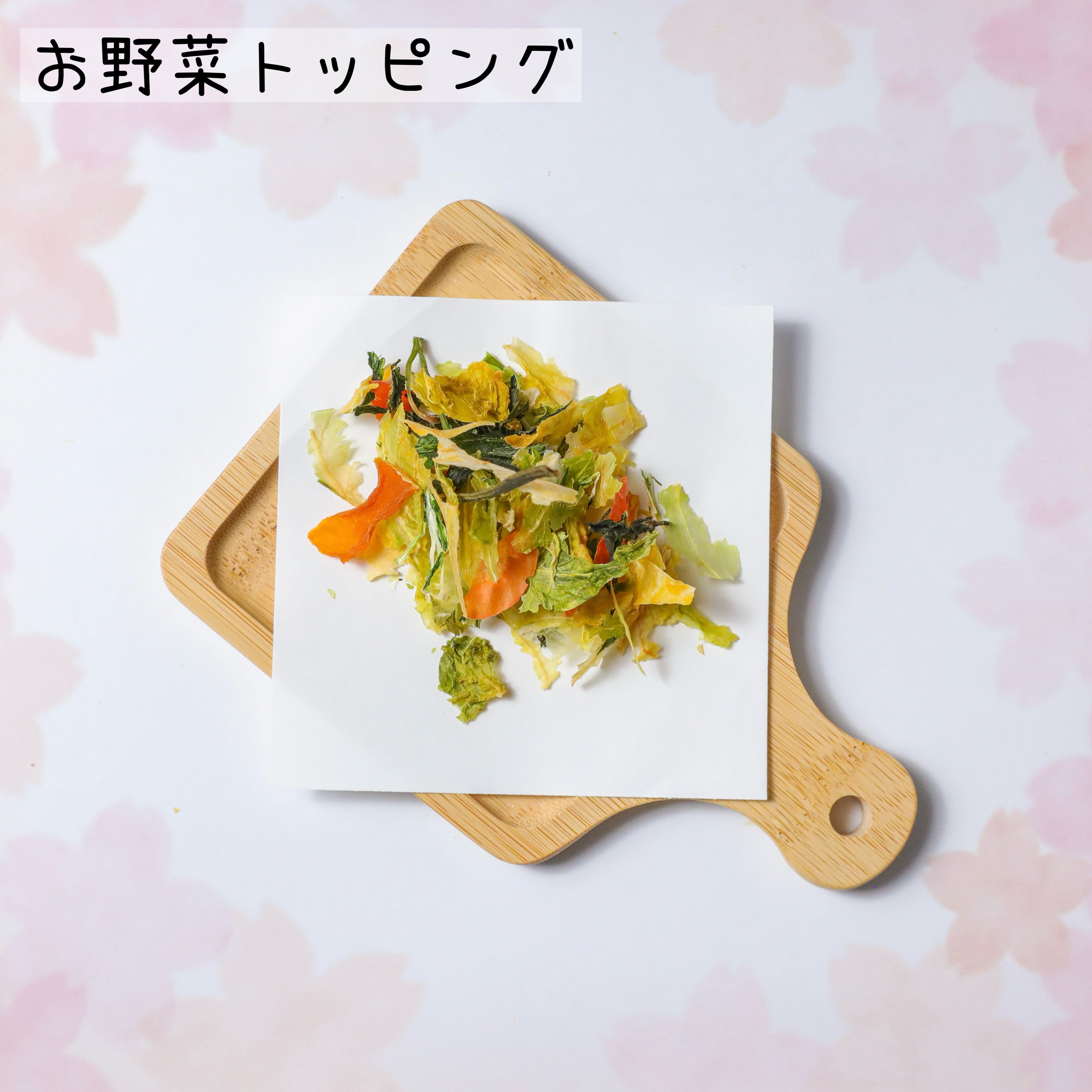お湯を注ぎ、電子レンジで加熱(500wで2分程度)するだけでOK!また、夜にのうちに水を注いで冷蔵庫(必ず冷蔵庫)で一晩おくと、朝にはふっくらとしたお野菜が完成します。簡単で便利なお野菜トッピングをぜひお試しください!(食べやすい温度で与えて下さい。)