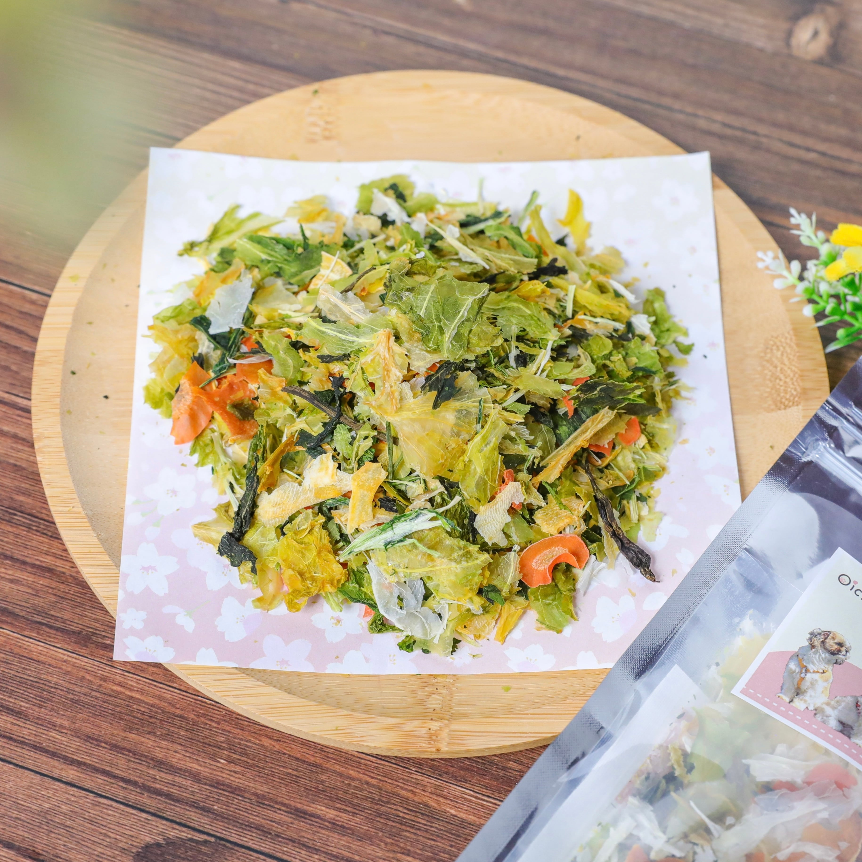 お野菜を丁寧に加熱処理してから乾燥させていますので、お湯で戻すだけで新鮮なお野菜が楽しめます!ビタミンや食物繊維をたっぷり含んでいますので体に嬉しい栄養素がいっぱいです。戻したお野菜は、驚くほど茹でたての美味しさを再現しています。その戻し汁はスープとしてフードにかけてあげるのもオススメです!旬なお野菜を中心に数種類組み合わせてお作りしています。内容量:20g