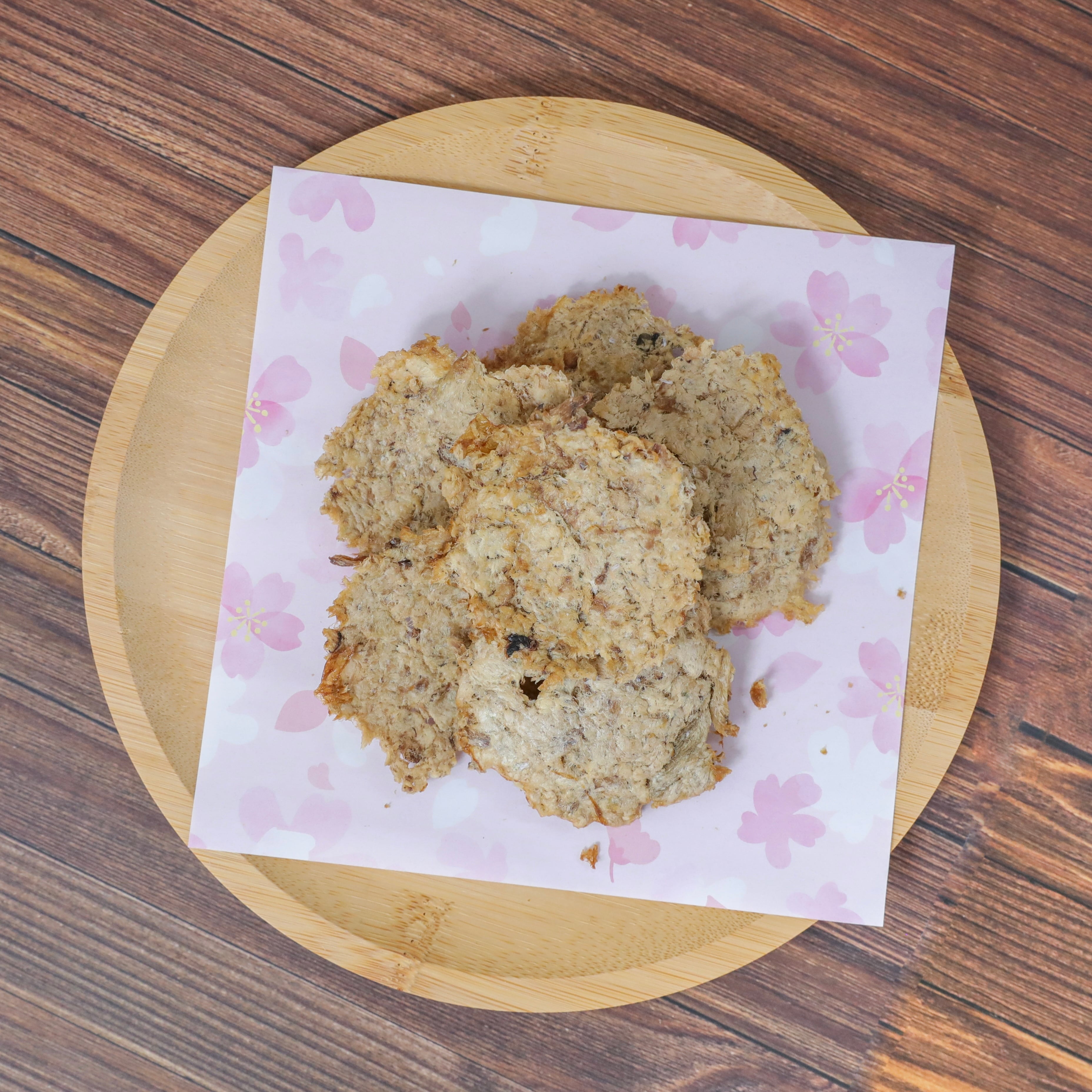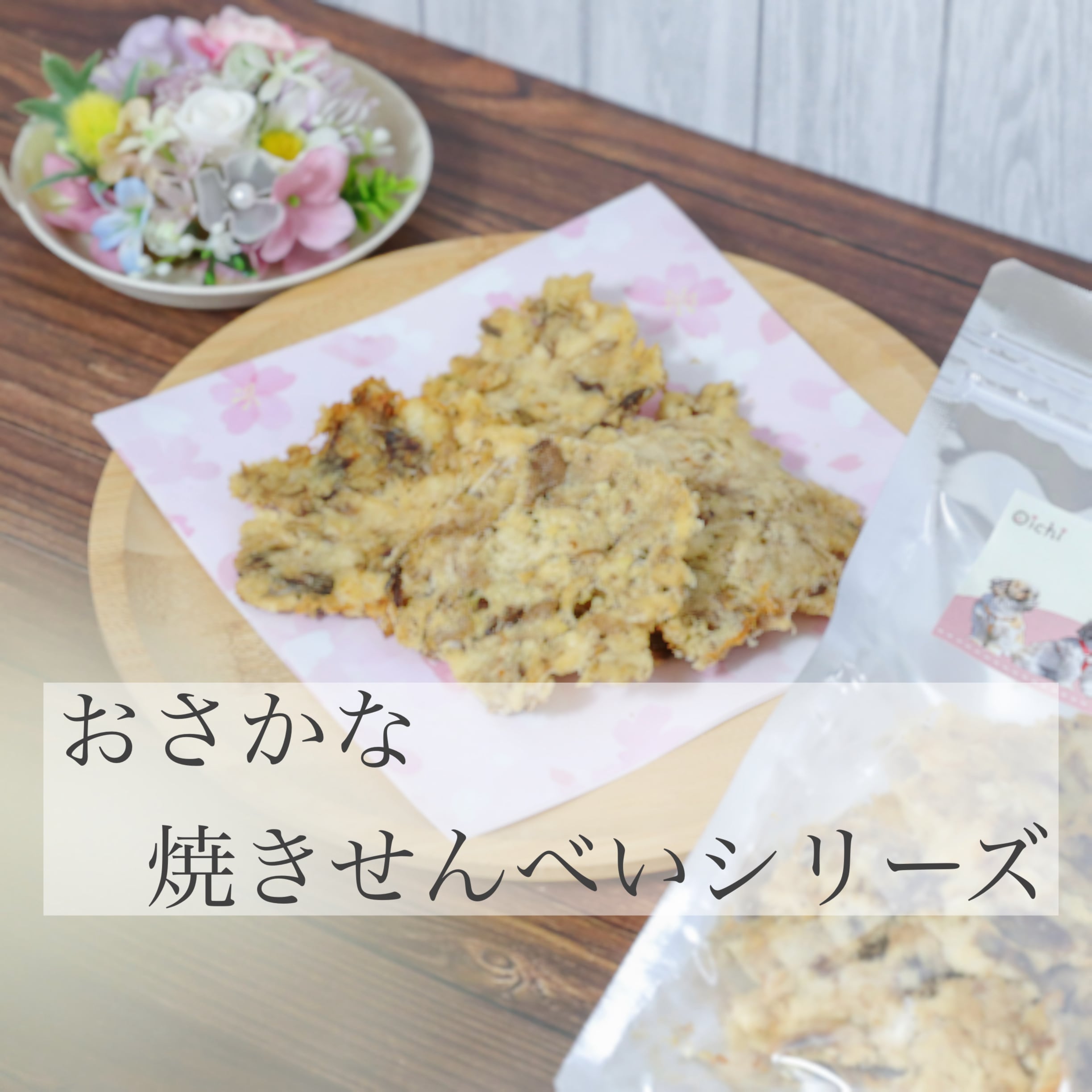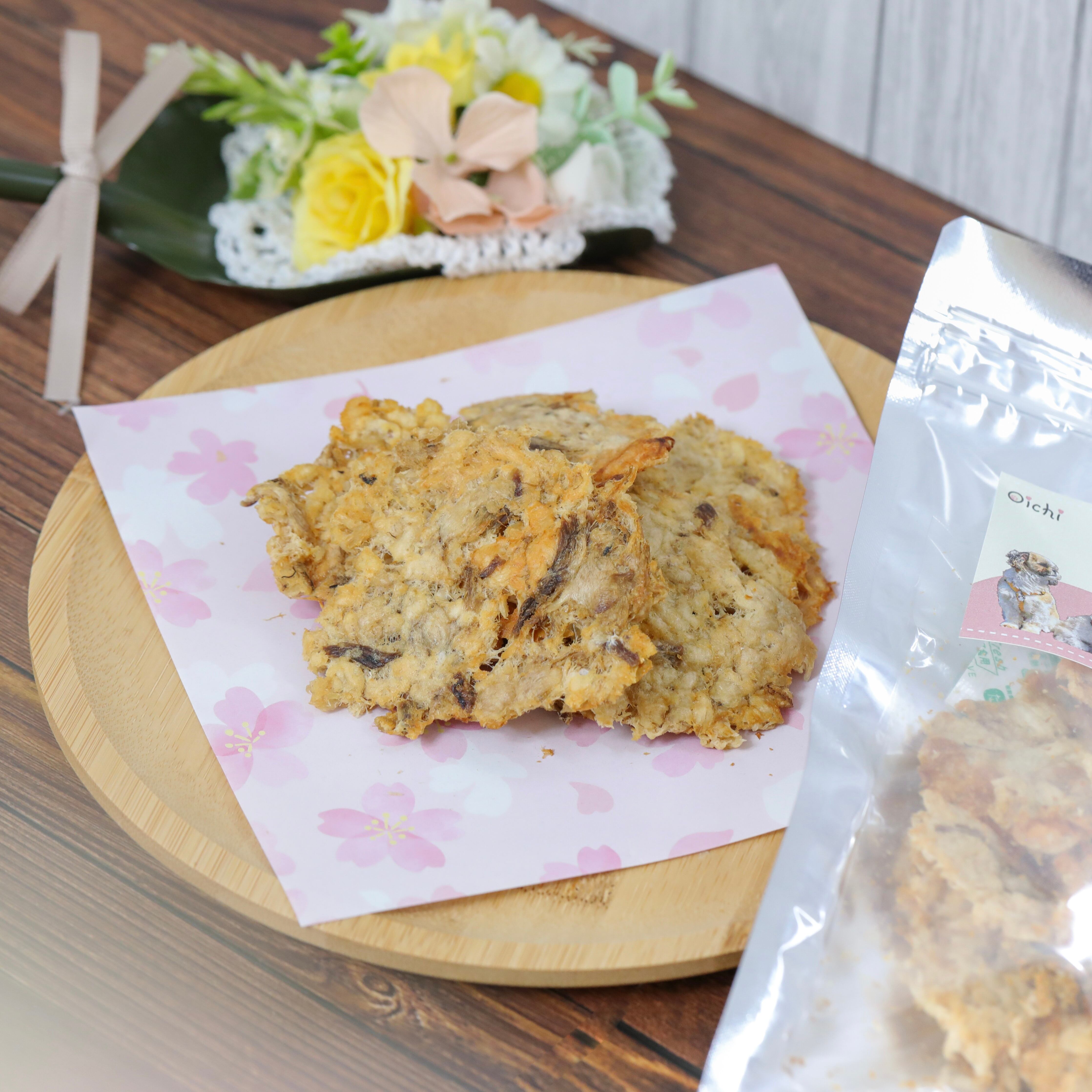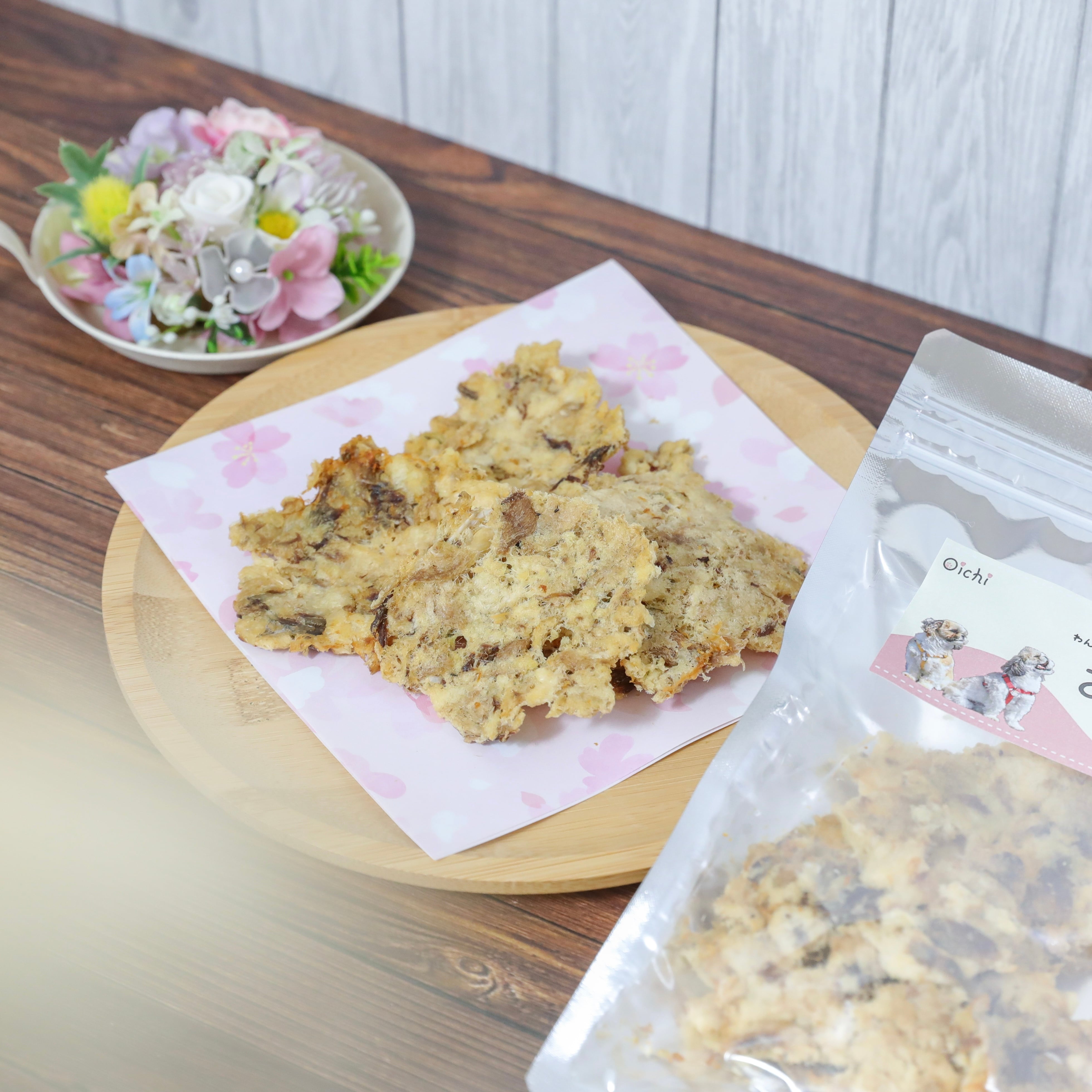 新鮮な魚を贅沢に使用し、香ばしく焼き上げることによりジャーキーとは一味違った焼きせんべいに仕上げました。大満足のサイズ感で食べやすいサイズにパリッと簡単に割れます。袋の中で崩れてしまった小さなせんべいや粉はいつものご飯にふりかけてお楽しみいただけます。魚好きのわんちゃんねこちゃんににぴったりなおやつです。