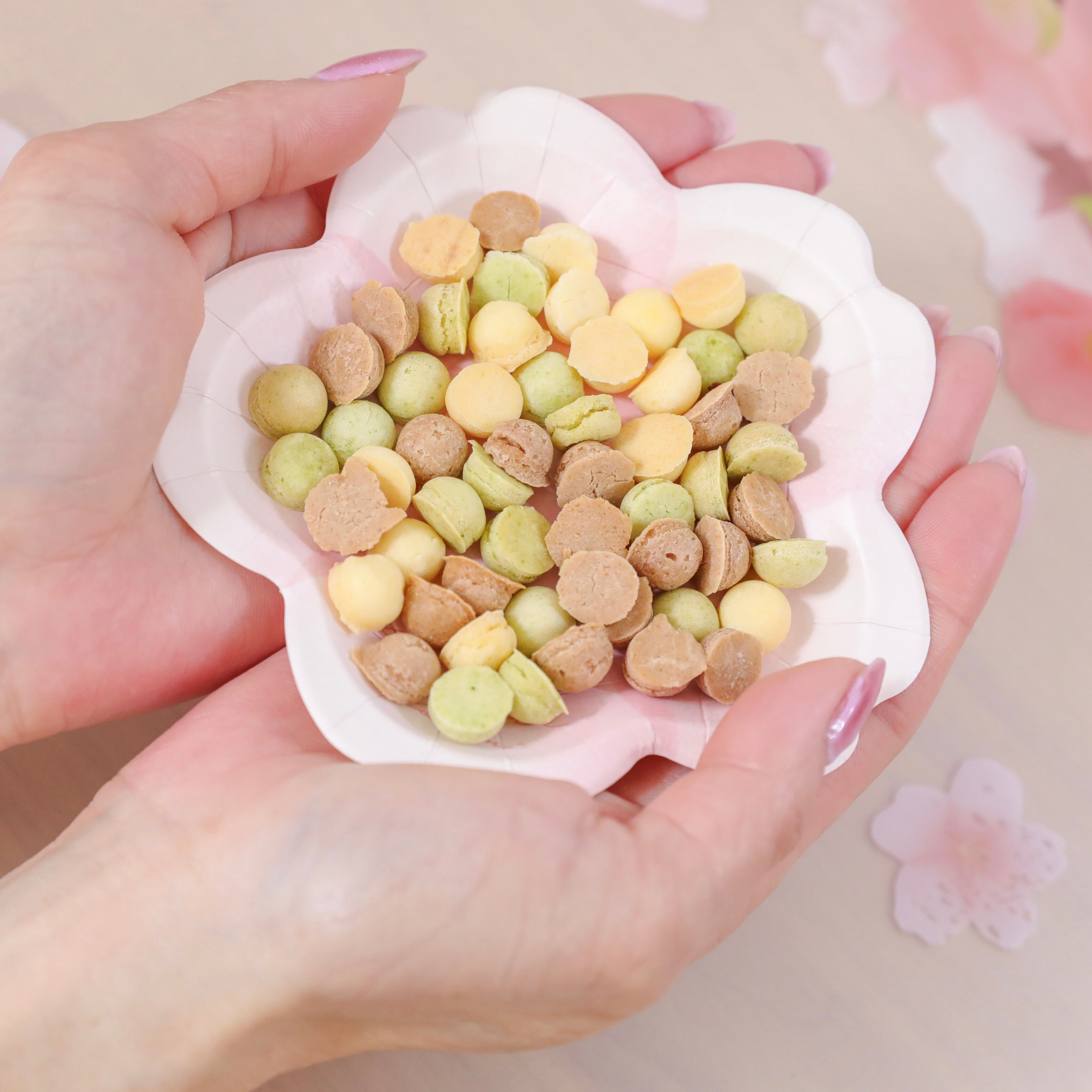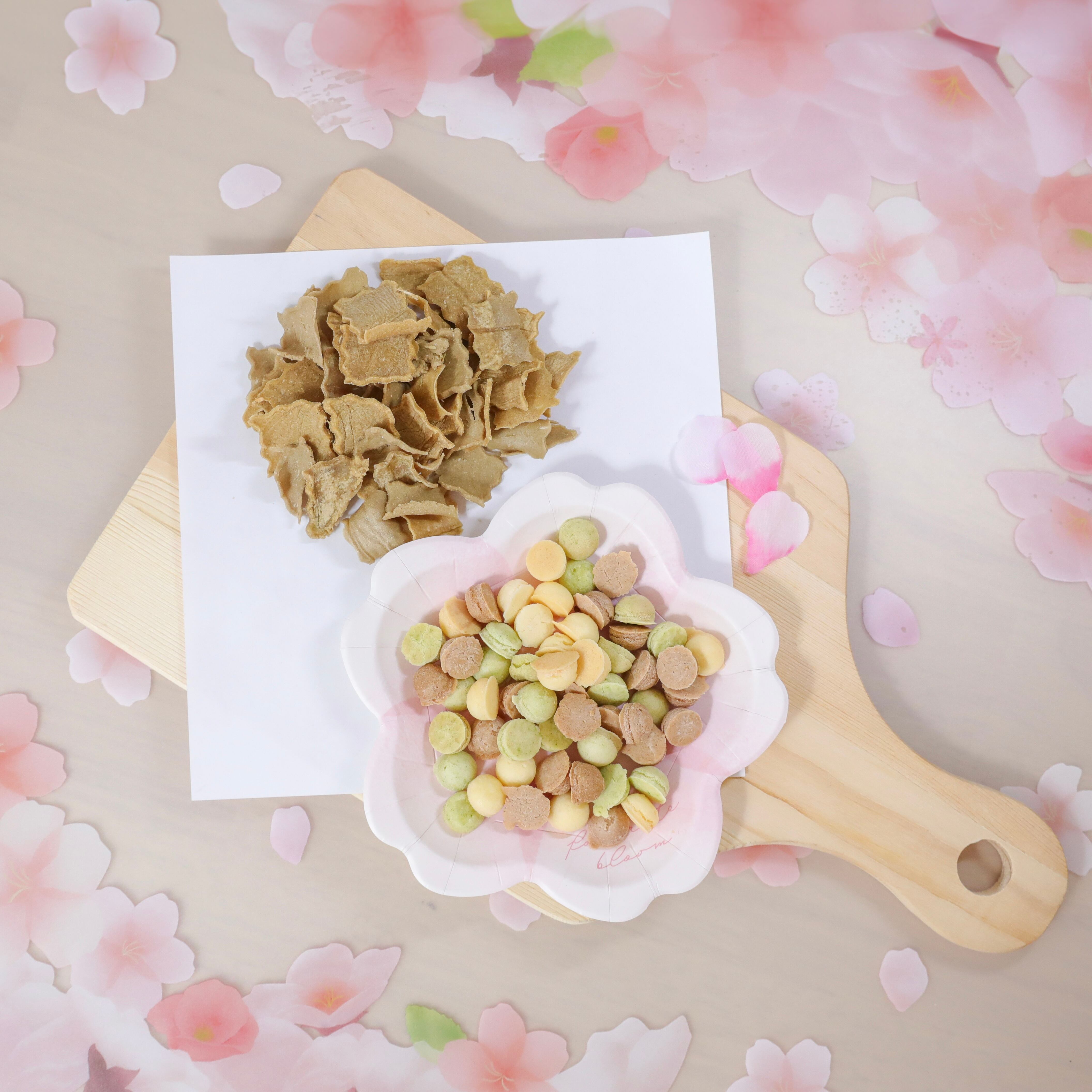 色鮮やかなお花見をイメージした春色やぎみるくぼーろ(さつまいも・いちご・ケール)とランダムおさかなスナック(キューブ・せんべい)のセットです。